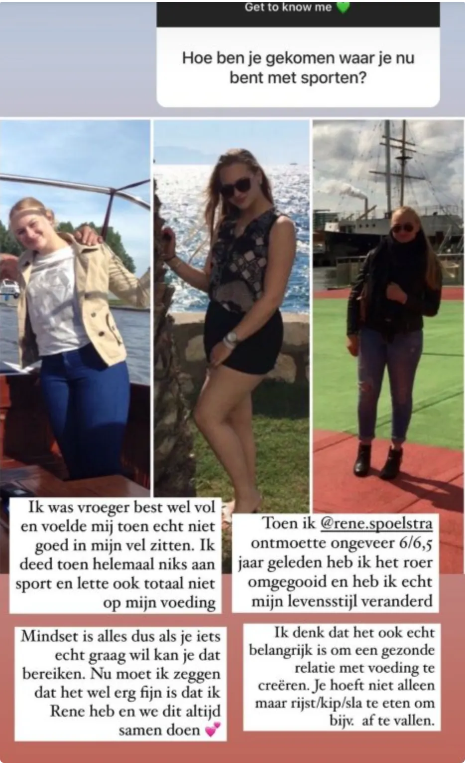 Over haar borstvergroting zegt ze het volgende: "Mijn borsten gingen letterlijk weg door al het trainen, dus daar was ik wel heel onzeker over. Voor de rest heb ik keihard getraind voor hoe mijn lichaam nu is!"