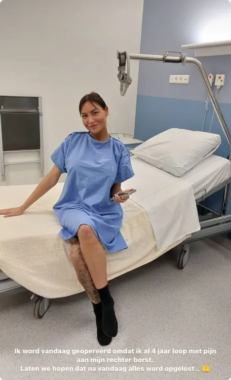 "Daar ga ik dan", schrijft de realityster bij een foto van zichzelf in het ziekenhuis. "Ik word vandaag geopereerd omdat ik al vier jaar loop met pijn in mijn rechterborst. Laten we hopen dat na vandaag alles is opgelost", schrijft Esmee.