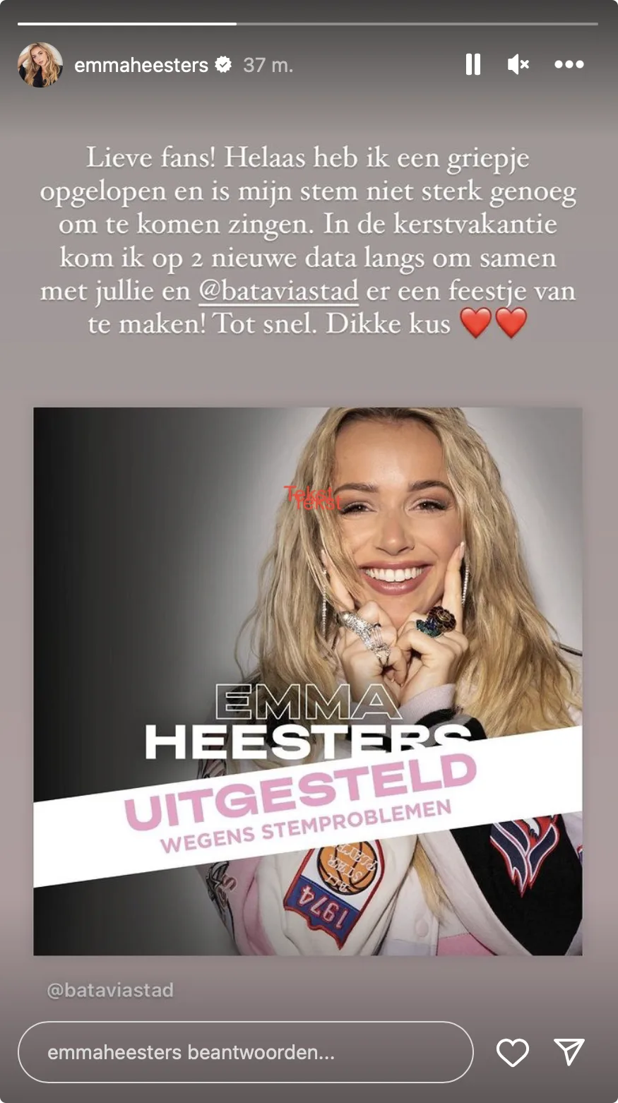 "Helaas heb ik een griepje opgelopen en is mijn stem niet sterk genoeg om te komen zingen", begint Emma haar bericht, die op vrijdag en zaterdag een optreden zou verzorgen. "In de kerstvakantie kom ik op twee nieuwe data langs", verzekert ze haar fans.