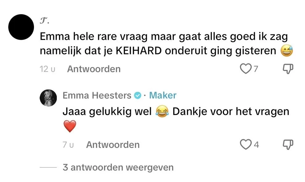 "Emma, hele rare vraag: maar gaat alles goed? Ik zag namelijk dat je keihard onderuit ging gisteren", zo schrijft een volger van Emma onder een bericht van de zangeres op TikTok