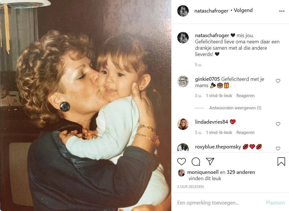 Ook zijn zus Natascha herdenkt haar oma. Op Instagram schrijft zij: "Mis jou. Gefeliciteerd lieve oma neem daar een drankje samen met al die andere lieverds!"