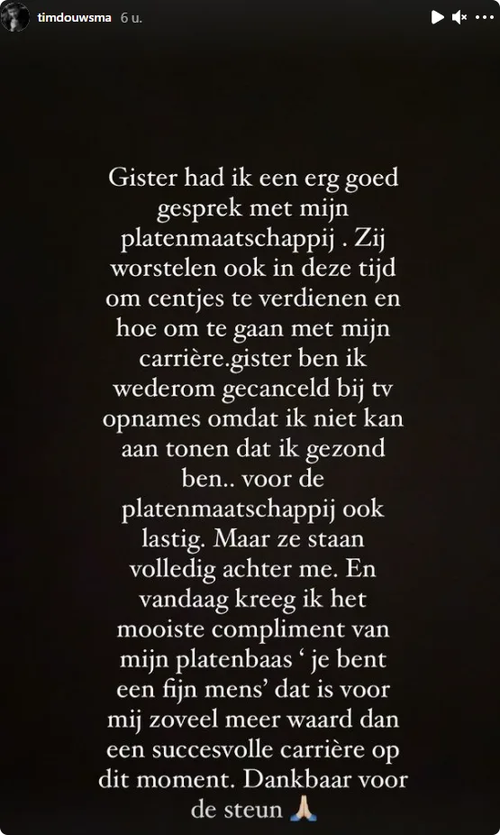 "Gisteren had ik een erg goed gesprek met mijn platenmaatschappij", schrijft Tim op Instagram. "Zij worstelen ook in deze tijd om centjes te verdienen en hoe om te gaan met mijn carrière."