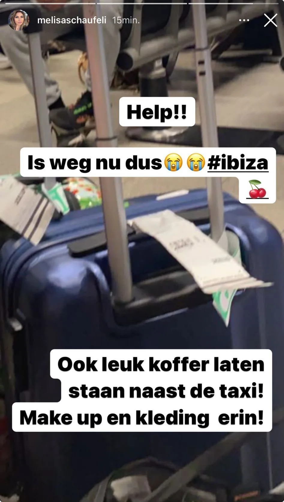 ''Help! Is weg nu dus'', aldus Melisa op Instagram bij een foto van haar koffer. ''Ook leuk: koffer laten staan naast de taxi! Make-up en kleding zit erin.'' De twee waren onderweg naar het Spaanse eiland Ibiza, maar beginnen hun vakantie dus zonder koffer.