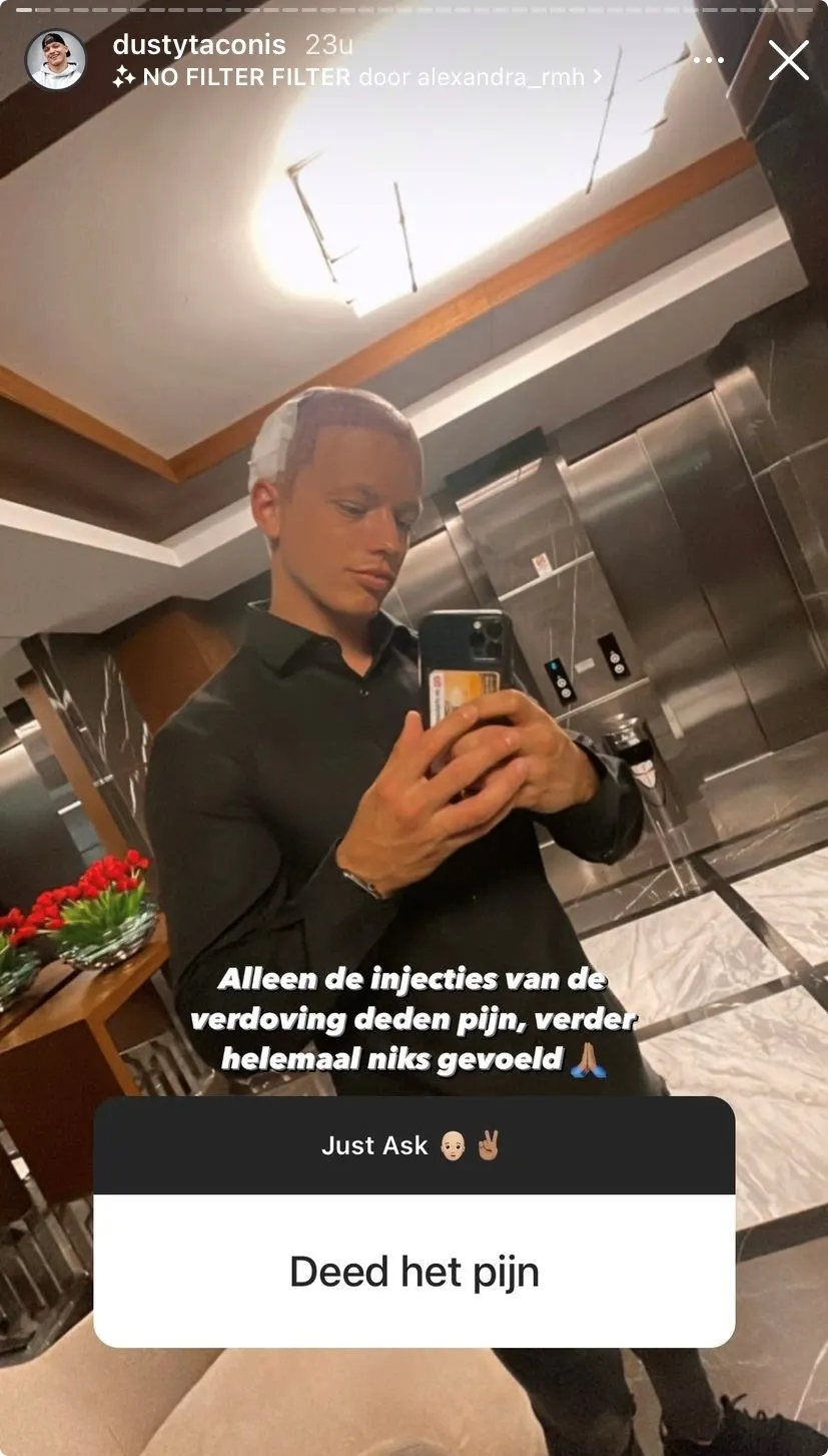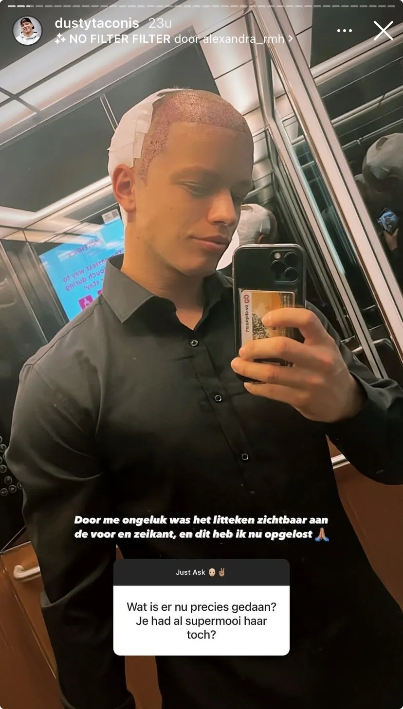 Dusty Taconis, bekend van het programma Ex On The Beach, heeft een haartransplantatie laten doen. De realityster deelt hierover verschillende berichten op zijn Instagram Stories.