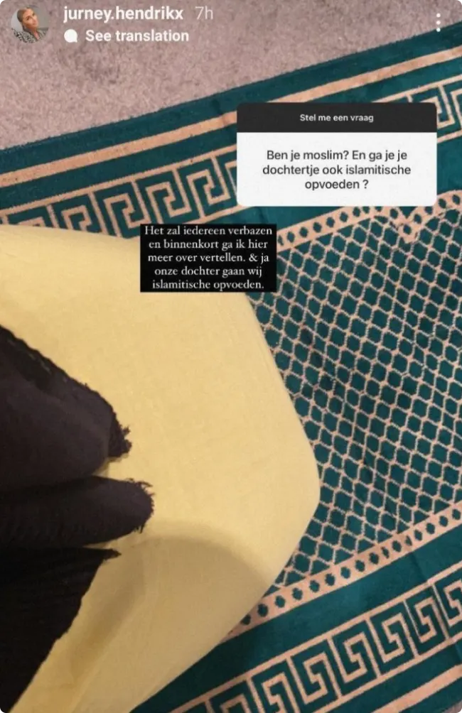 Iemand vraagt op Instagram of Jørney moslim is en of zij hun dochtertje ook islamitisch gaan opvoeden. Daarop zegt de kersverse moeder het volgende: "Het zal iedereen verbazen en binnenkort ga ik hier meer over vertellen en ja onze dochter gaan wij islamitische opvoeden."