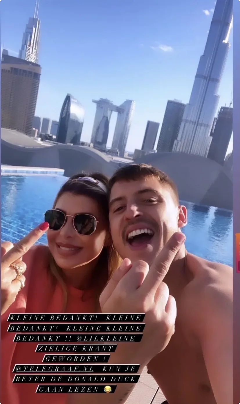 "Kleine bedankt! Kleine bedankt! Kleine Kleine bedankt!!" is er te lezen in de Stories op Estelle haar Instagram. Ook is te zien hoe de twee hun middelvinger opsteken en lachen naar de camera. Op de achtergrond is het uitzicht van Dubai te zien met een prachtig zwembad.