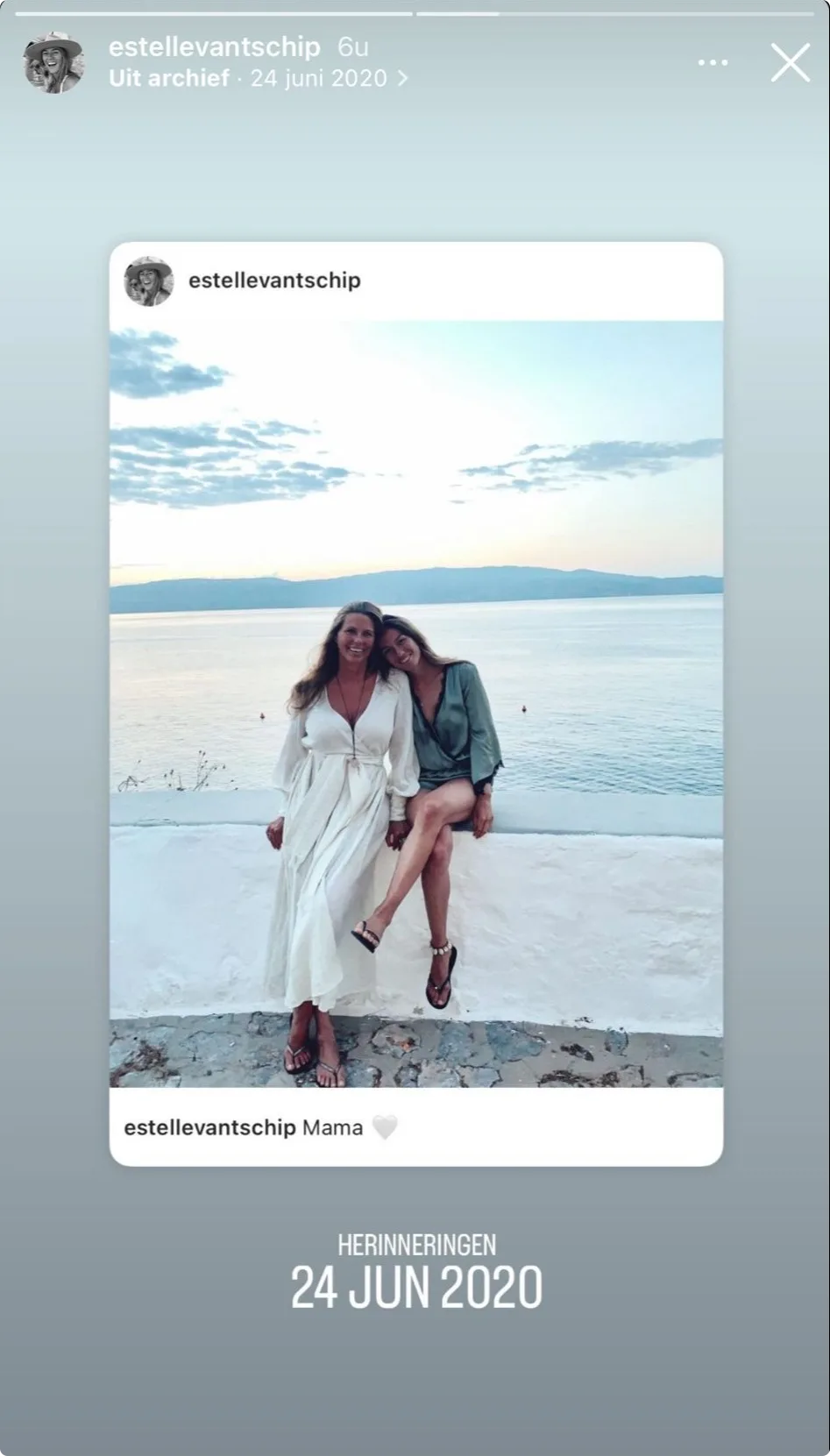 Estelle haalt een foto naar boven die zij vier jaar geleden op het platform publiceerde. Hierop is te zien dat zij samen met haar moeder aan de Griekse kust zit. "Mama", staat onder het originele bericht. Op het Instagram-verhaal valt te lezen: "Herinneringen 24 juni 2020."