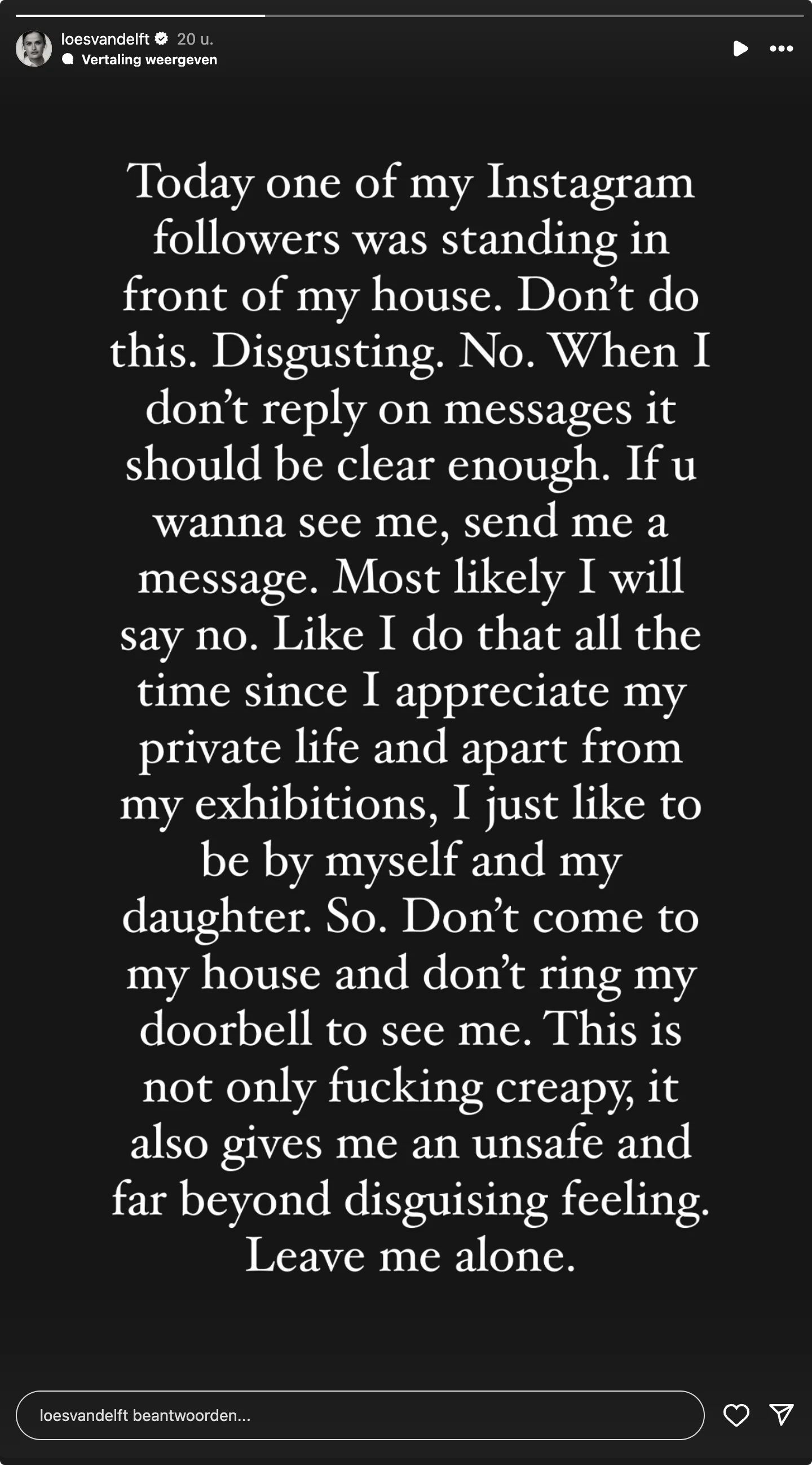 "Dus kom niet naar mijn huis en druk niet op de bel om mij te zien. Het is niet alleen heel eng, het geeft mij ook een onveilig gevoel. Laat mij met rust."