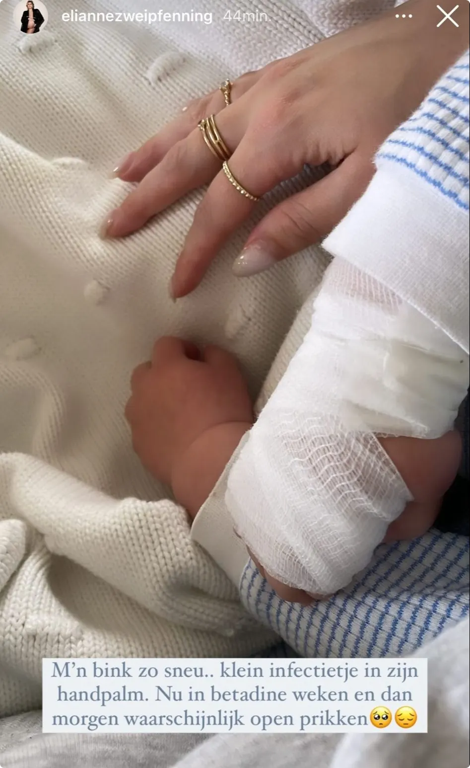 "M'n bink, zo sneu...", schrijft ze bij een foto van de kleine, waarop te zien is dat hij in het verband zit. "Klein infectietje in zijn handpalm. Nu in de Betadine weken en dan morgen waarschijnlijk open prikken."
