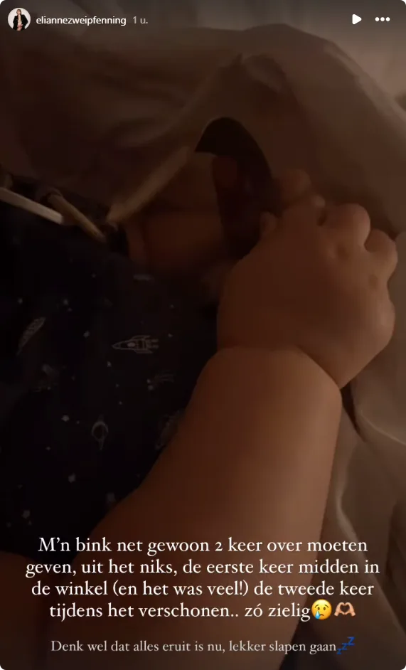 "M'n bink net gewoon 2 keer over moeten geven, uit het niks", zo schrijft Elianne in haar Instagram Stories. "De eerste keer midden in de winkel, de tweede keer tijdens het verschonen. Zó zielig."