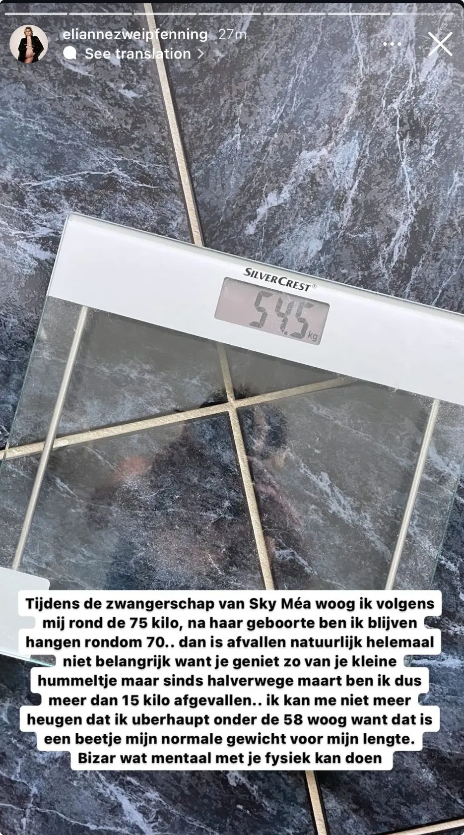 Elianne zegt in haar Instagram Stories dat ze inmiddels meer dan vijftien kilo is afgevallen en dat dit vooral komt vanwege de breuk en de nasleep hiervan. "Bizar wat mentaal met je fysiek kan doen", schrijft ze onder meer.