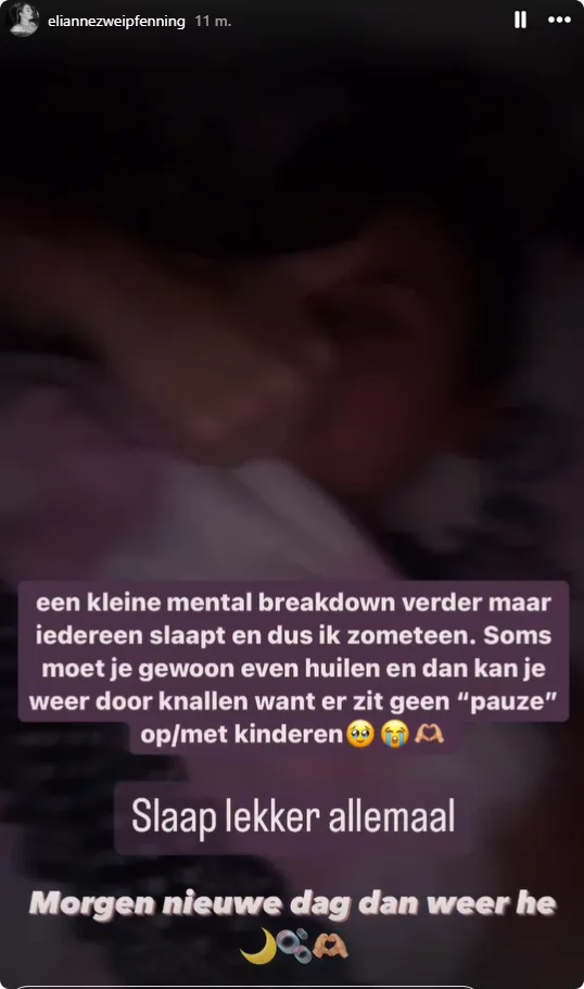 Elianne heeft een pittige tijd achter de rug. De ex van de bekende zanger is namelijk op de IC beland door een hersenvliesontsteking. Maandag is het extra zwaar voor Elianne. Ze schrijft namelijk op haar Stories het volgende: "Een kleine mental breakdown verder, maar iedereen slaapt al en dus ik zo meteen. Soms moet je gewoon even huilen en dan kan je weer doorknallen, want er zit geen 'pauze' op/met kinderen".