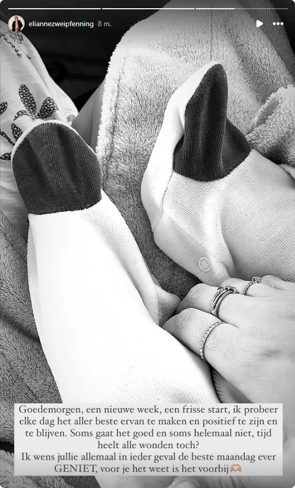 Bij een foto in haar verhaal schrijft ze: "Goedemorgen! Een nieuwe week, een frisse start, ik probeer er elke dag het allerbeste van te maken en positief te zijn en te blijven. Soms gaat het goed en soms helemaal niet, tijd heelt alle wonden toch? Ik wens jullie allemaal in ieder geval de beste maandag ever. GENIET, voor je het weet is het voorbij."