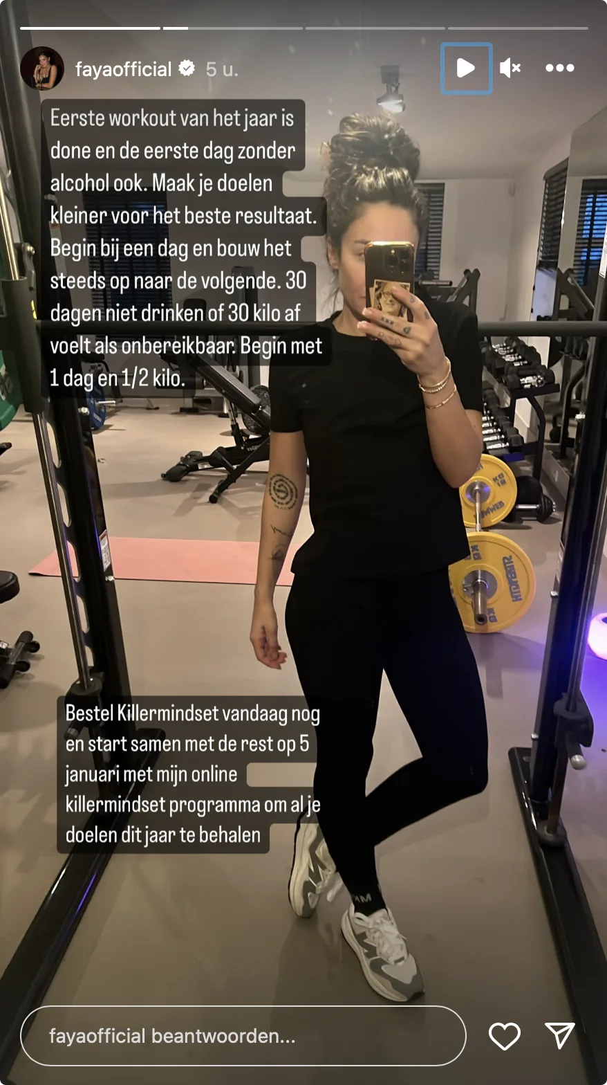 Bij een foto waarop te zien is dat Fajah haar best gedaan heeft in de gym, schrijft ze: "Maak je doelen kleiner voor het beste resultaat. Begin bij een dag en en bouw het steeds op naar de volgende." Dat klinkt volgens Fajah een stuk bereikbaarder dan "30 dagen niet drinken of 30 kilo eraf".