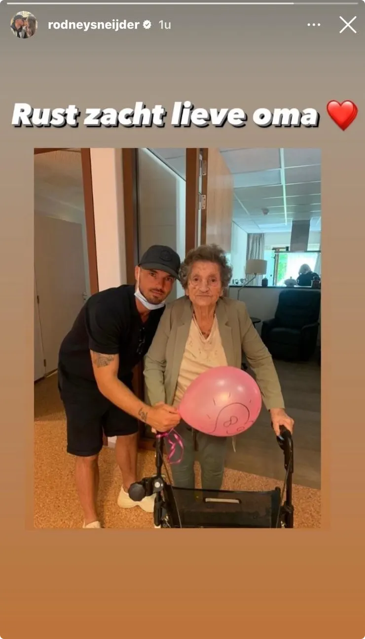 "Rust zacht lieve oma", schrijft Rodney in zijn Instagram Stories bij een foto van zijn oma.