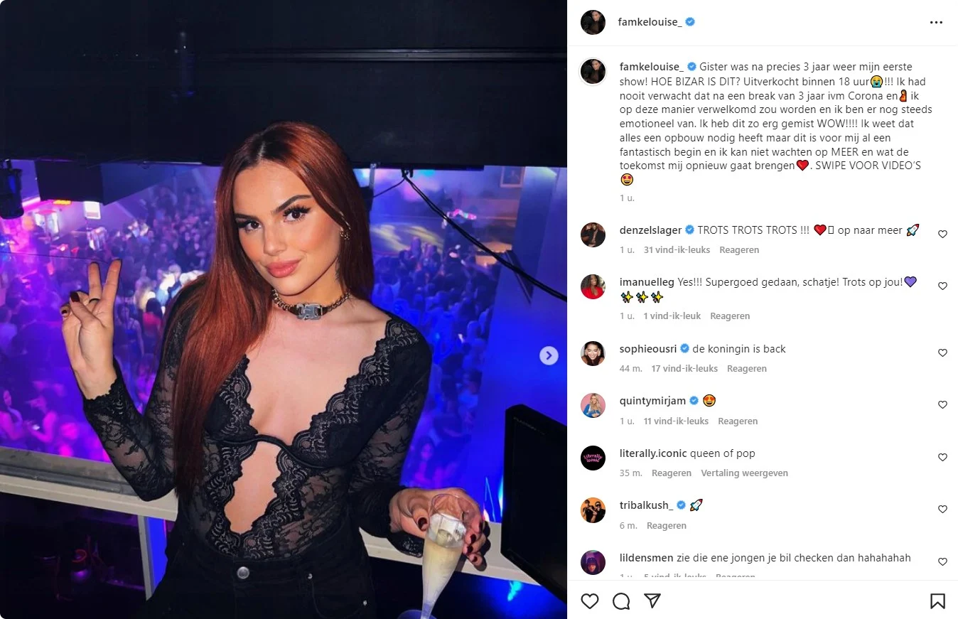 "Ik had nooit verwacht dat na een break van 3 jaar ivm Corona en zwangerschap ik op deze manier verwelkomd zou worden en ik ben er nog steeds emotioneel van", schrijft de zangeres op Instagram bij een aantal beelden van het optreden. "Ik heb dit zo erg gemist WOW!!!! Ik weet dat alles een opbouw nodig heeft maar dit is voor mij al een fantastisch begin en ik kan niet wachten op MEER en wat de toekomst mij opnieuw gaat brengen."