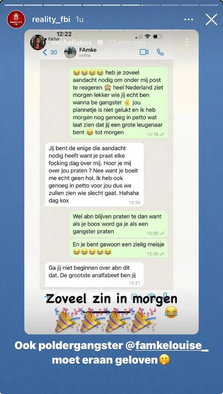 Daarop reageert Famke: "Jij bent de enige die aandacht nodig heeft want je praat elke f*cking dag over mij. Hoor je mij over jou praten? Nee want je boeit me echt geen hol. Ik heb ook genoeg in petto voor jou dus we zullen zien wie slecht gaat. Hahaha dag Kox." Vervolgens gaat het ook nog over de manier waarop Famke volgens Michella praat ('gangster').