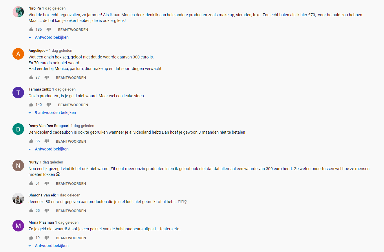 In de vlog waarin Monica aankondigt dat de box te bestellen is, belooft ze dat er voor meer dan 300 euro aan producten in zullen zitten. Dat vinden haar volgers nogal tegenvallen: "Vreselijk die box. Alle fans zijn opgelicht," luidt één van de reacties op Twitter. "Ligt het aan mij of is de box gewoon erg teleurstellend! €70,00 is het absoluut niet waard, vind ik. Jammer," vindt iemand anders. Ook op Youtube zijn fans teleurgesteld over de box waar onder andere een zonnebril, kauwgom, haar eigen magazine, haarlak en een koekje in zit. "Zou echt balen als ik hier €70,- voor betaald zou hebben," zegt iemand daar.