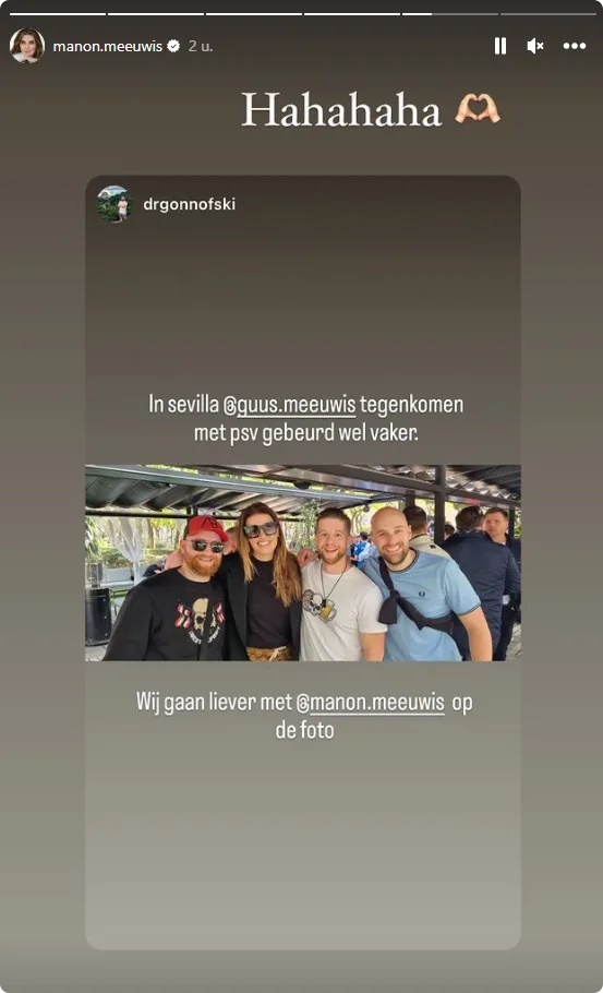 Dat blijkt uit de foto die Manon in haar Instagramverhaal deelt. Op de foto is Manon, samen met de 'fans' te zien, die bij de foto schrijven: "In Sevilla Guus tegen komen.... wij gaan liever met Manon op de foto."