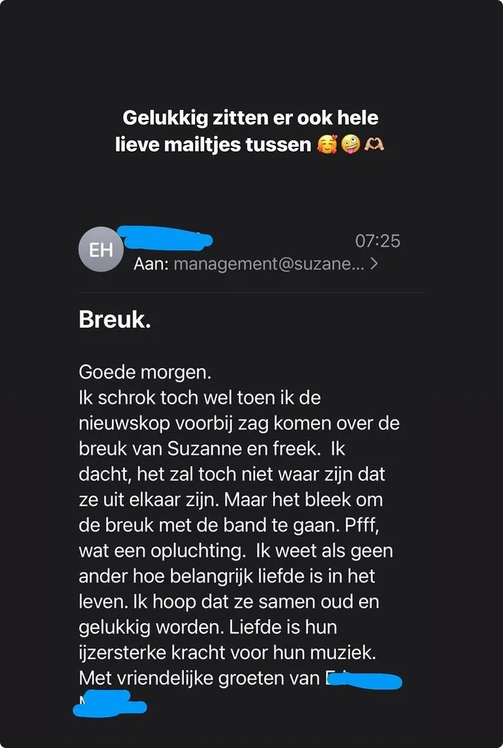 Suzan & Freek delen in hun Instagram Stories een mailtje van een ongeruste fan. "Gelukkig zitten er ook heel lieve mailtjes tussen", schrijven ze in een reactie hierop.