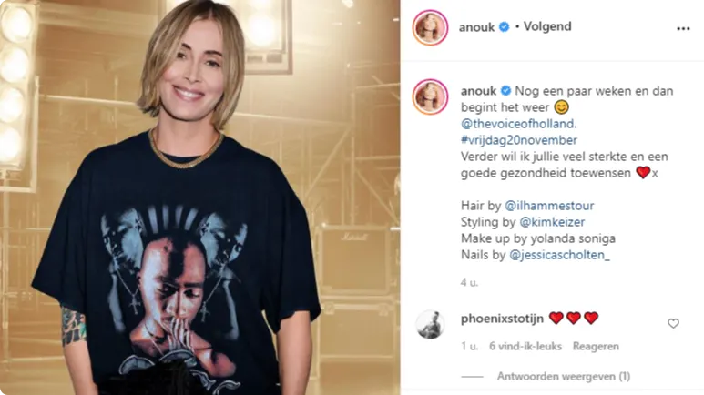 Haar volgers reageren enthousiast. Chantal Janzen en Patrick Martens reageren met hartjes en Inge de Bruijn vindt dat de zangeres er 'weer top uitziet'. Robin Martens is vooral onder de indruk van het shirt dat Anouk draagt: 'En dat T-shirtttt😍😍😍😍', reageert de actrice.
