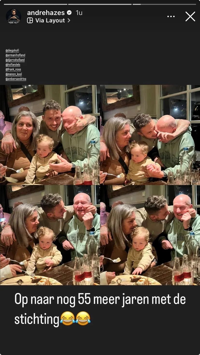 "Op naar nog 55 meer jaren met de stichting," aldus André bij een collage in zijn Instagram Stories. André laat weten dat onder meer neef Djarno Hofland, de zoon van Els, ook van de partij was bij het etentje. Djarno feliciteert zijn moeder met: "Gefeliciteerd allerliefste moeder van de wereld."