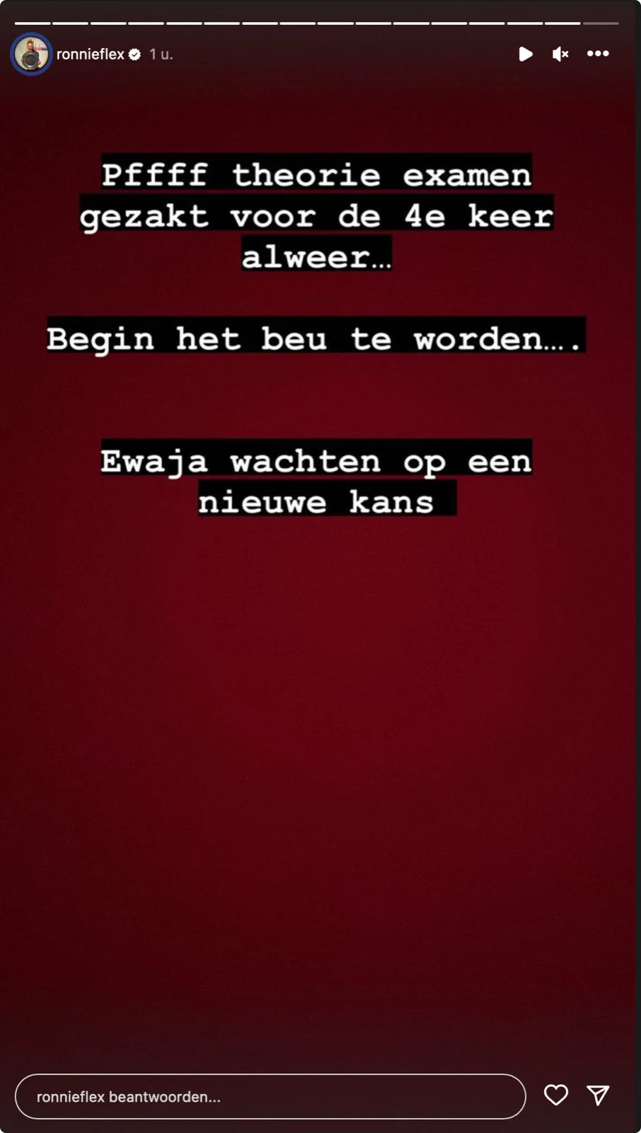 Ronnie Flex is voor de vierde keer gezakt voor zijn theorie-examen. Dat schrijft de zanger in zijn Instagram Stories.