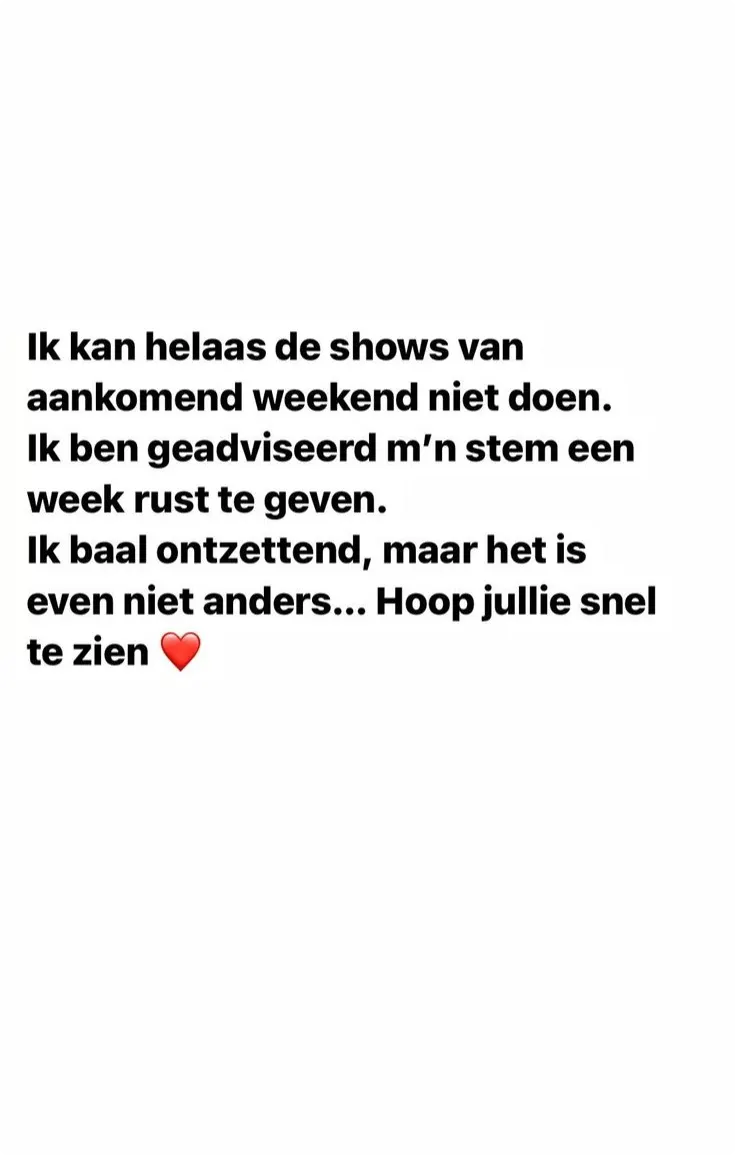 "Ik baal ontzettend, maar het is even niet anders", schrijft de zanger die onder meer een grote hit scoorde met het nummer Hyperventilatie. "Hoop jullie snel te zien."