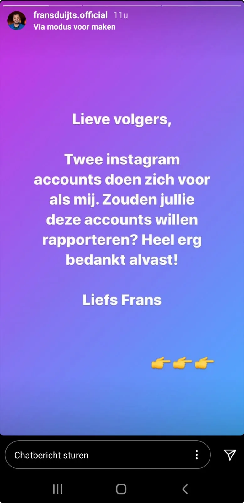 "Lieve volgers, twee Instagram-accounts doen zich voor als mij", valt hij op zijn Instagram Stories met de deur in huis. "Zouden jullie deze accounts willen rapporteren? Heel erg bedankt alvast!"