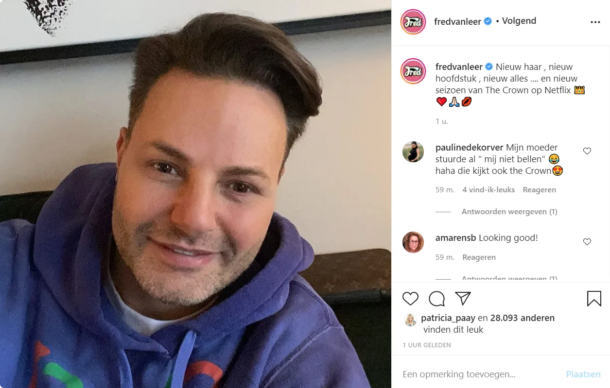Dit schrijft hij op Instagram bij een foto van zijn nieuwe look. "Nieuw haar, nieuw hoofdstuk , nieuw alles en nieuw seizoen van The Crown op Netflix", laat Fred weten bij de onderstaande foto.
