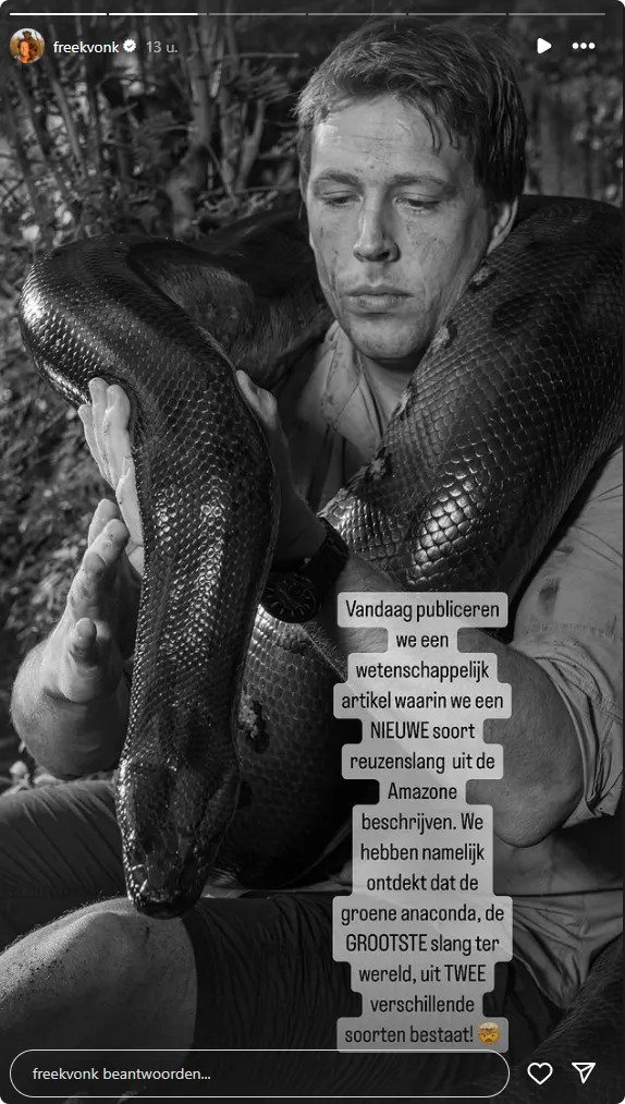 Freek Vonk heeft in het Amazoneregenwoud een nieuwe anacondasoort ontdekt. De Nederlandse bioloog, die eerder dit jaar nog een beet van een giftig dier kreeg (zie video), maakte deel uit van een internationaal team van vijftien biologen uit acht landen dat de vondst van de noordelijke groene anaconda deed. Freek deelt maandag op Instagram beelden van de slang die tot 8 meter lang en 200 kilo zwaar kan worden.