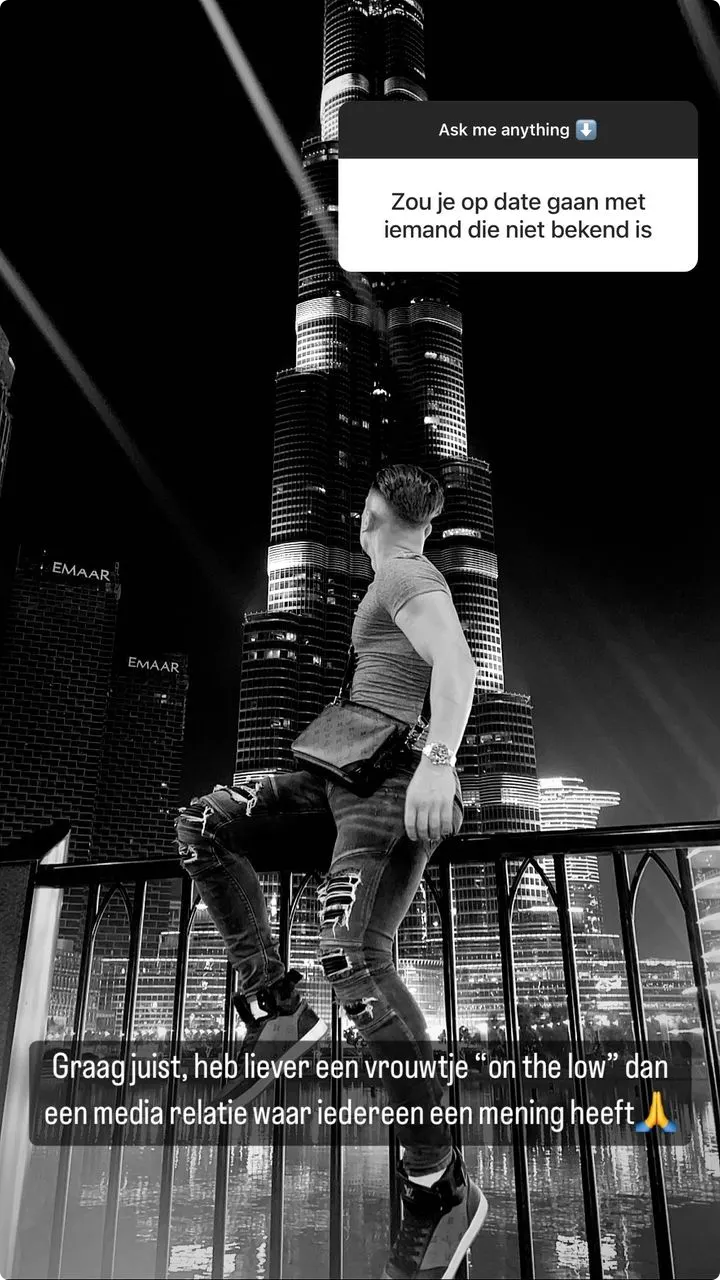 Een andere volger vraagt Harrie of hij ook met een niet-bekende Nederlander zou daten. "Graag juist, ik heb liever een vrouwtje 'on the low' dan een mediarelatie waar iedereen een mening heeft", laat de EOTB-er weten.