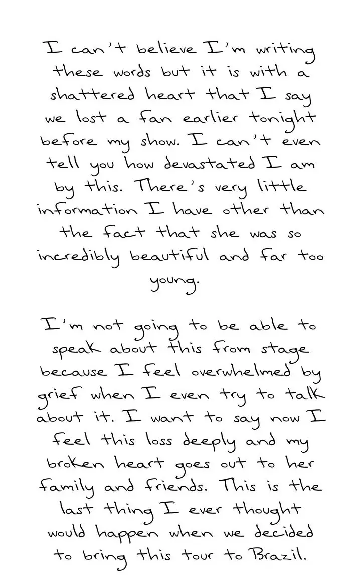 Ik kan niet eens vertellen hoe kapot ik hiervan ben. Er is nog heel weinig informatie, behalve dat ze zo ongelooflijk mooi was en veel te jong", aldus de zangeres, die naar eigen zeggen overweldigd is door verdriet. "Dit is het laatste wat ik ooit had gedacht dat zou gebeuren toen we besloten om deze tour naar Brazilië te brengen."