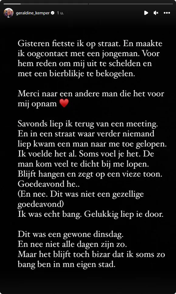 "Gisteren fietste ik op straat. En maakte ik oogcontact met een jongeman", laat de blondine weten. "Voor hem reden om mij uit te schelden en met een bierblikje te bekogelen." Een andere man stond klaar om het voor Geraldine op te nemen.