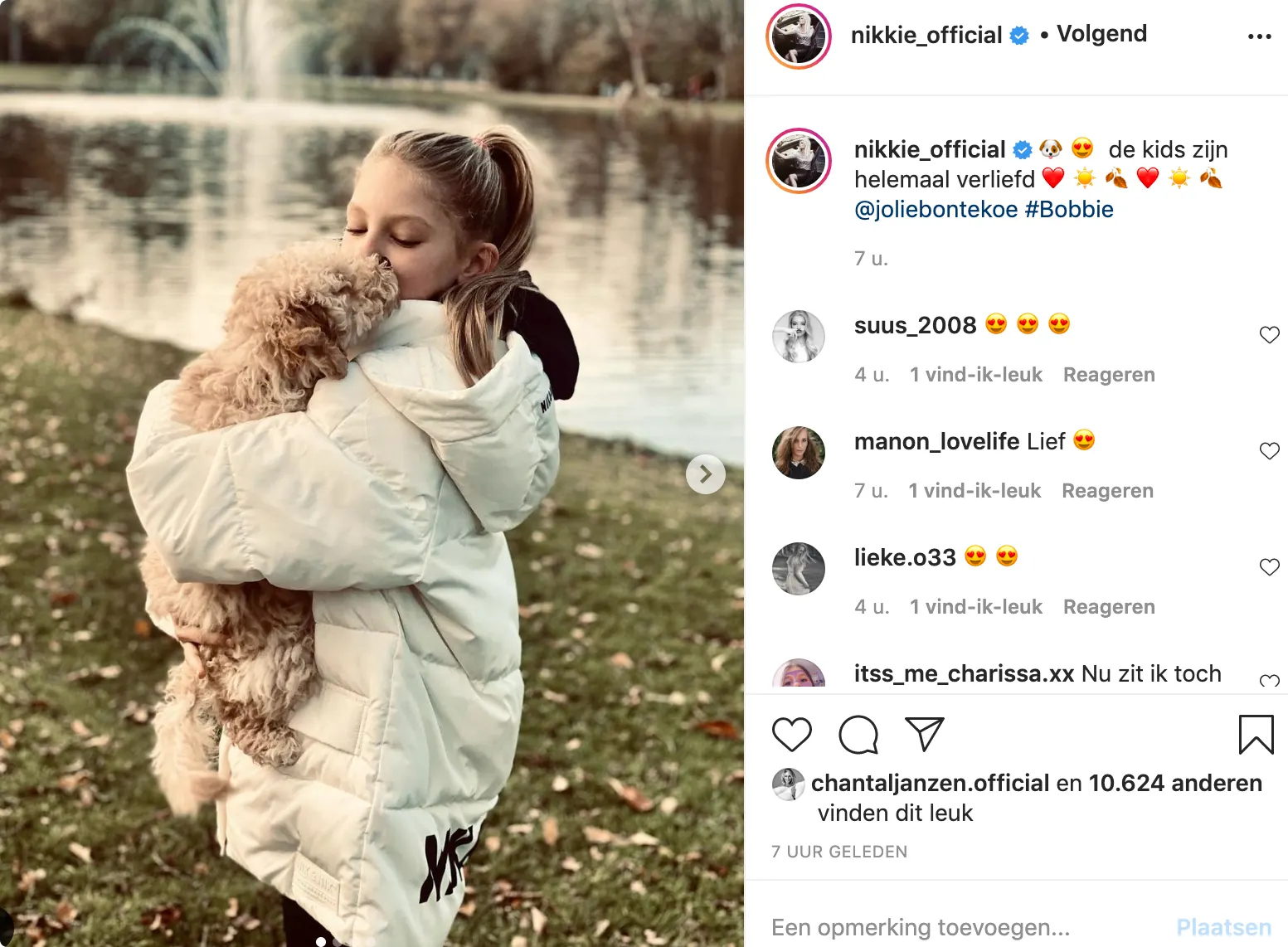 "De kids zijn helemaal verliefd", schrijft Nikkie op Instagram bij een paar foto's van de viervoeter. In eerste instantie stond de ontwerpster niet echt te springen om een hond in huis te hebben, zo vertelde ze eerder in RTL Boulevard. Maar ook zij is inmiddels stapelgek op Bobby.