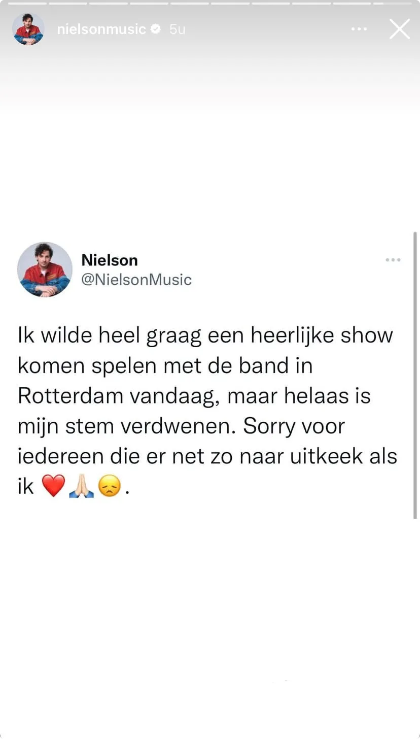"Ik wilde heel graag een heerlijke show komen spelen met de band in Rotterdam vandaag, maar helaas is mijn stem verdwenen. Sorry voor iedereen die er net zo naar uitkeek als ik", schrijft de 32-jarige Niels Littooij, zoals de zanger echt heet, op Twitter.