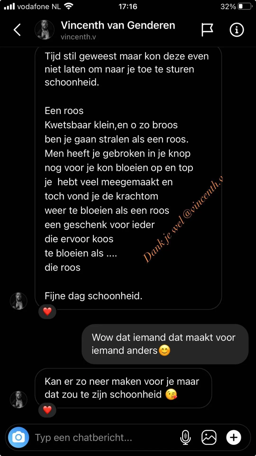 "Een roos Kwetsbaar klein, en o zo broos ben je gaan stralen als een roos. Men heeft je gebroken in je knop nog voor je kan bloeien op en top. Je hebt veel meegemaakt en toch vond je de kracht om weer te bloeien als een roos. Een geschenk voor ieder die ervoor koos te bloeien als... die roos."
