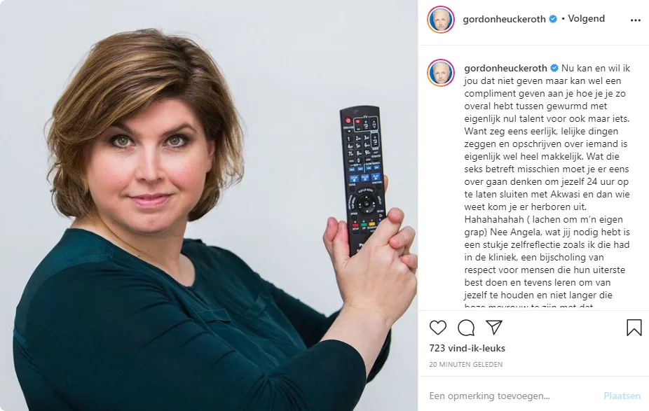 Gordon heeft twee lange teksten gewijd aan het verbaal vernietigen van Angela de Jong. De columniste schreef Gordon's optreden bij OP1 de grond in en dit laat de presentator duidelijk niet van zijn kant gaan...