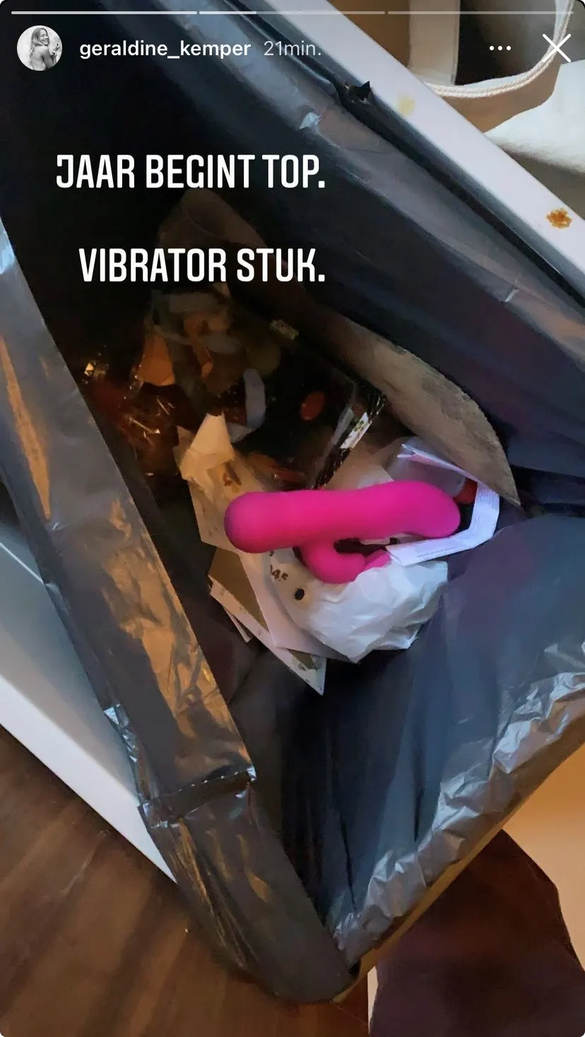 ''Jaar begint top. Vibrator stuk'', aldus Kemper bij de onderstaande afbeelding. Te zien is dat haar roze vibrator in de prullenbak is gegooid.