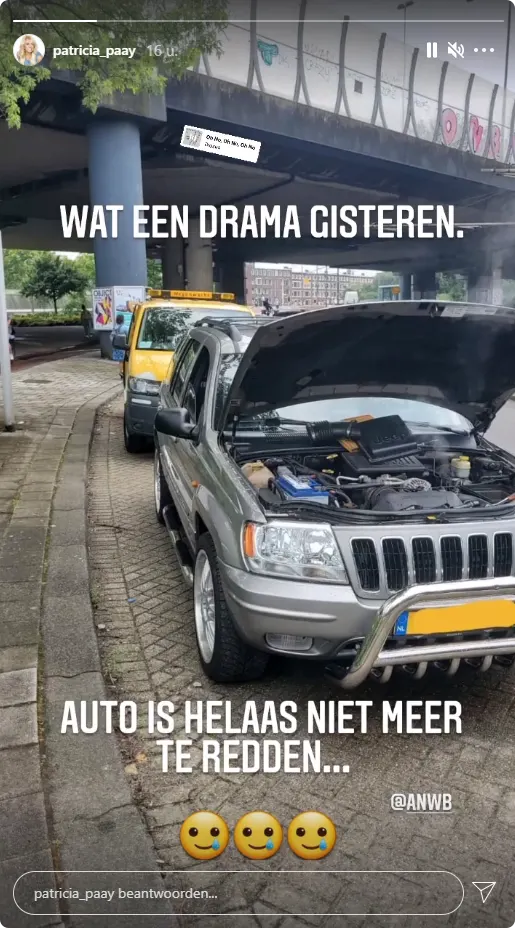 Oh no! Wat een pech voor Patricia Paay, gisteren stond ze ineens langs de weg omdat haar auto het heeft begeven. Helaas is de auto niet meer te redden, maar La Paay blijft positief.