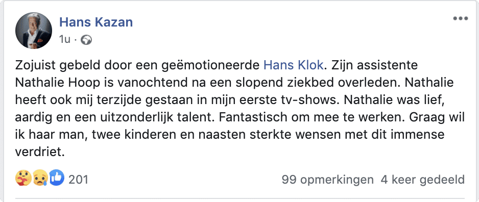Collega-illusionist Hans Kazàn deelt het droevige nieuws op zijn Facebookpagina. "Zojuist gebeld door een geëmotioneerde Hans Klok. Zijn assistente Nathalie Hoop is vanochtend na een slopend ziekbed overleden. Nathalie heeft ook mij terzijde gestaan in mijn eerste tv-shows. Nathalie was lief, aardig en een uitzonderlijk talent. Fantastisch om mee te werken. Graag wil ik haar man, twee kinderen en naasten sterkte wensen met dit immense verdriet."