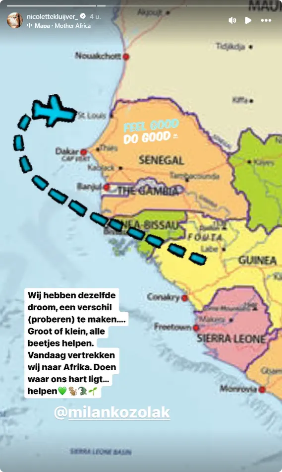 Nicolette Kluijver en haar nieuwe liefde (zie video) realiseren samen een langgekoesterde droom. Op Instagram deelt Nicolette een foto van een landkaart met daarop hun volgende bestemming: Senegal. De twee vertrekken naar het Afrikaanse land om zowel de mensen als de natuur daar te helpen.