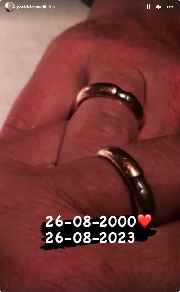 Het stel is namelijk precies 23 jaar getrouwd, zo deelt Paul in zijn Instagram Stories. Hij plaatst een foto van de twee ringen en zet er een hartje bij.