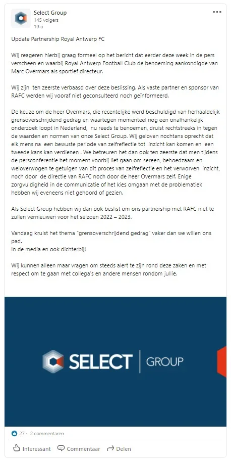 Select Group, een groot bedrijf gespecialiseerd in HR-oplossingen laat weten het partnerschap met de voetbalclub niet te verlengen voor het seizoen 2022-2023. "Wij zijn ten zeerste verbaasd over deze beslissing. Als vaste partner en sponsor van RAFC (Royal Antwerp Football Club red.) werden wij vooraf niet geconsulteerd noch geïnformeerd.”