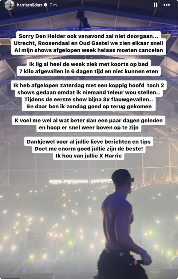 De reality-ster heeft al zijn shows afgelopen week moeten afzeggen. "Sorry Den Helder ook vanavond zal niet doorgaan...", schrijft hij op Instagram. Harrie ligt al heel de week ziek op bed. "Zeven kilo afgevallen in zes dagen tijd en niet kunnen eten." Afgelopen zaterdag heeft Harrie met "een koppig hoofd" toch twee shows gedaan omdat hij niemand wilde teleurstellen. "Tijdens de eerste show bijna drie keer flauwgevallen... Daar ben ik zondag goed op teruggekomen", aldus de reality-ster. Hij voelt zich gelukkig wat beter dan een paar dagen geleden en hoopt er snel weer beter te zijn. "Dankjewel voor al jullie lieve berichten en tips. Doet me enorm goed, jullie zijn de beste! Ik hou van jullie."