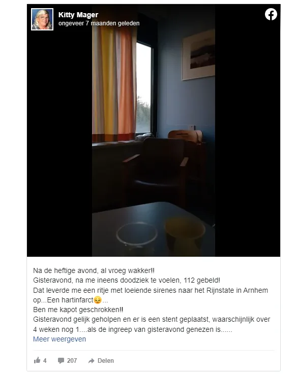 Ze bleek te zijn getroffen door een hartinfarct. "Ben me kapot geschrokken! Gisteravond gelijk geholpen en er is een stent geplaatst, waarschijnlijk over 4 weken nog 1."