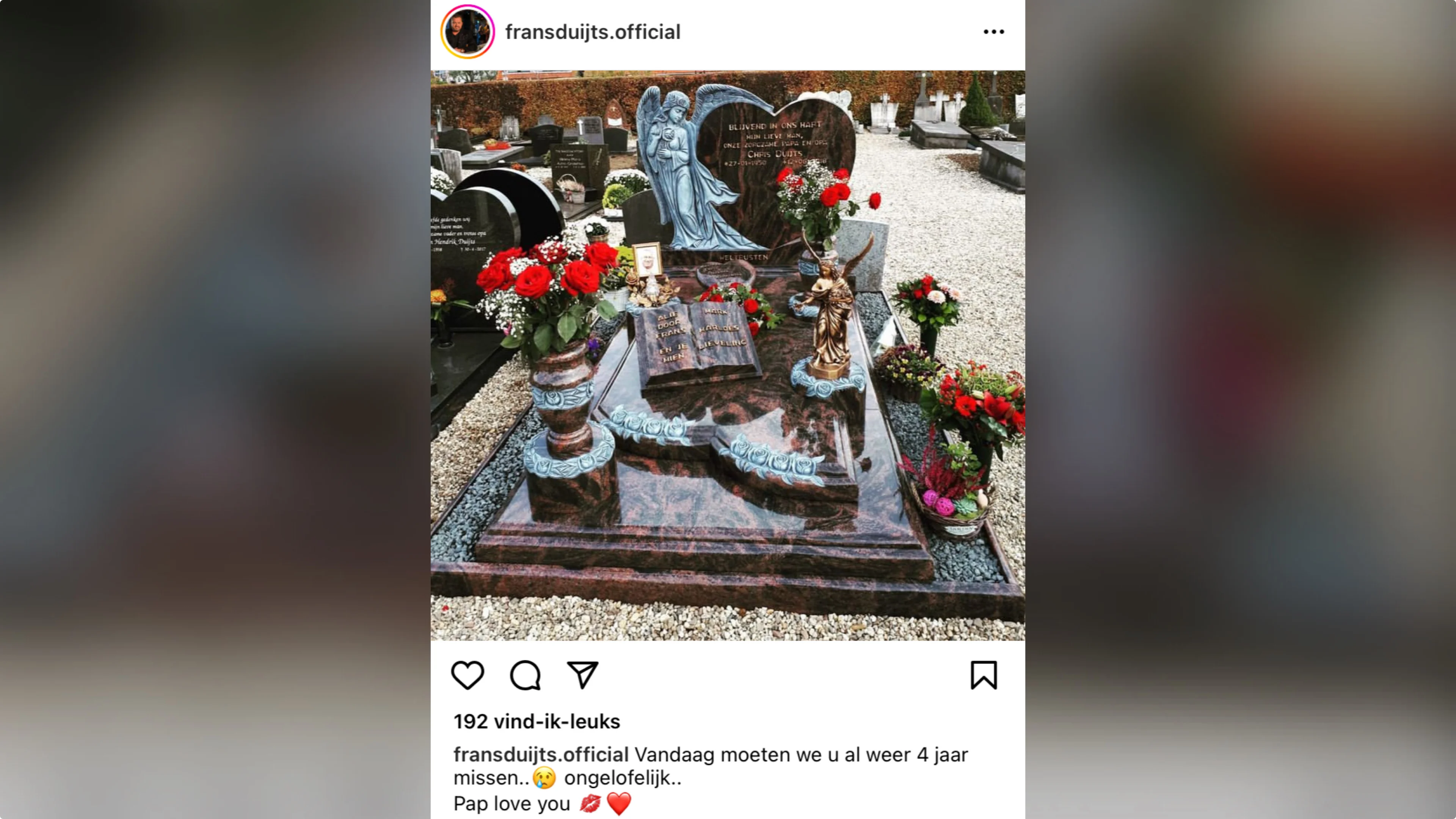 Op Instagram deelt de zanger een foto van zijn vaders graf en schrijft daarbij: "Vandaag moeten we u alweer vier jaar missen. Ongelooflijk... Pap, love you."