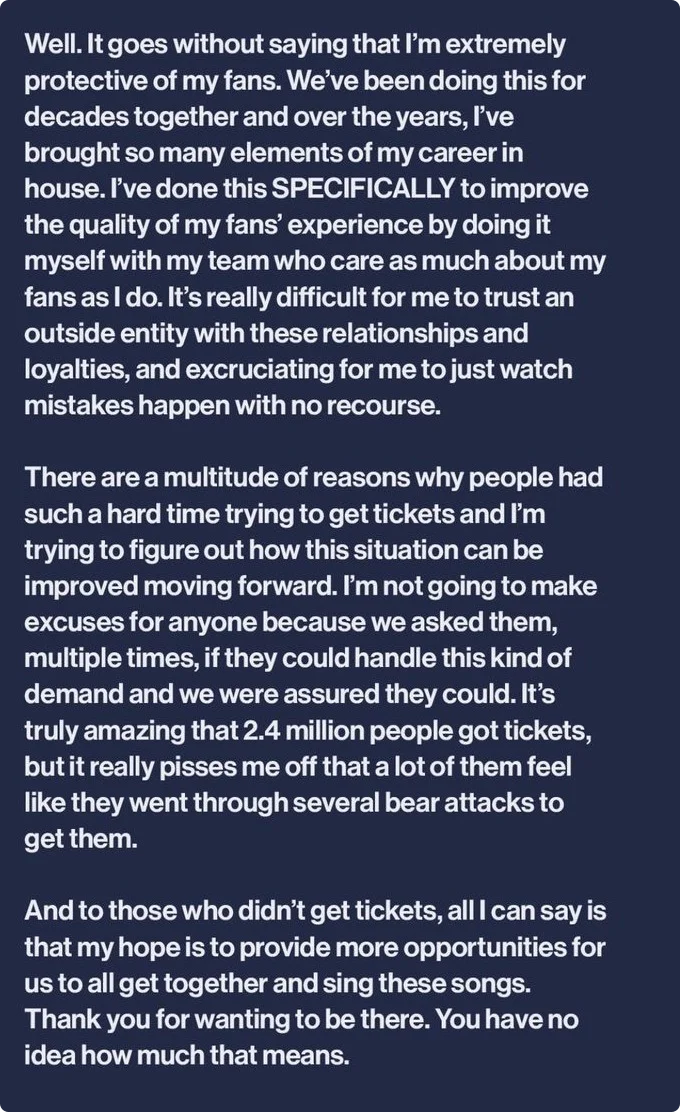 De zangeres schrijft eveneens dat ze het lastig vond om een andere partij in de arm te nemen voor de verkoop van haar tickets. "Het was ondraaglijk voor mij om deze fouten aan te zien", aldus Swift.