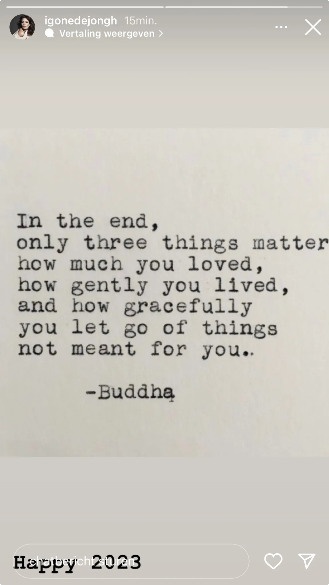Igone plaatste een afbeelding van een Quote van Buddha en schrijft daarbij: "Fijne 2023". De quote luidt als volgt: "Uiteindelijk zijn slechts drie dingen van belang, hoeveel je liefhad, hoe zacht je leefde en hoe gracieus je dingen losliet die niet voor jou bestemd waren...