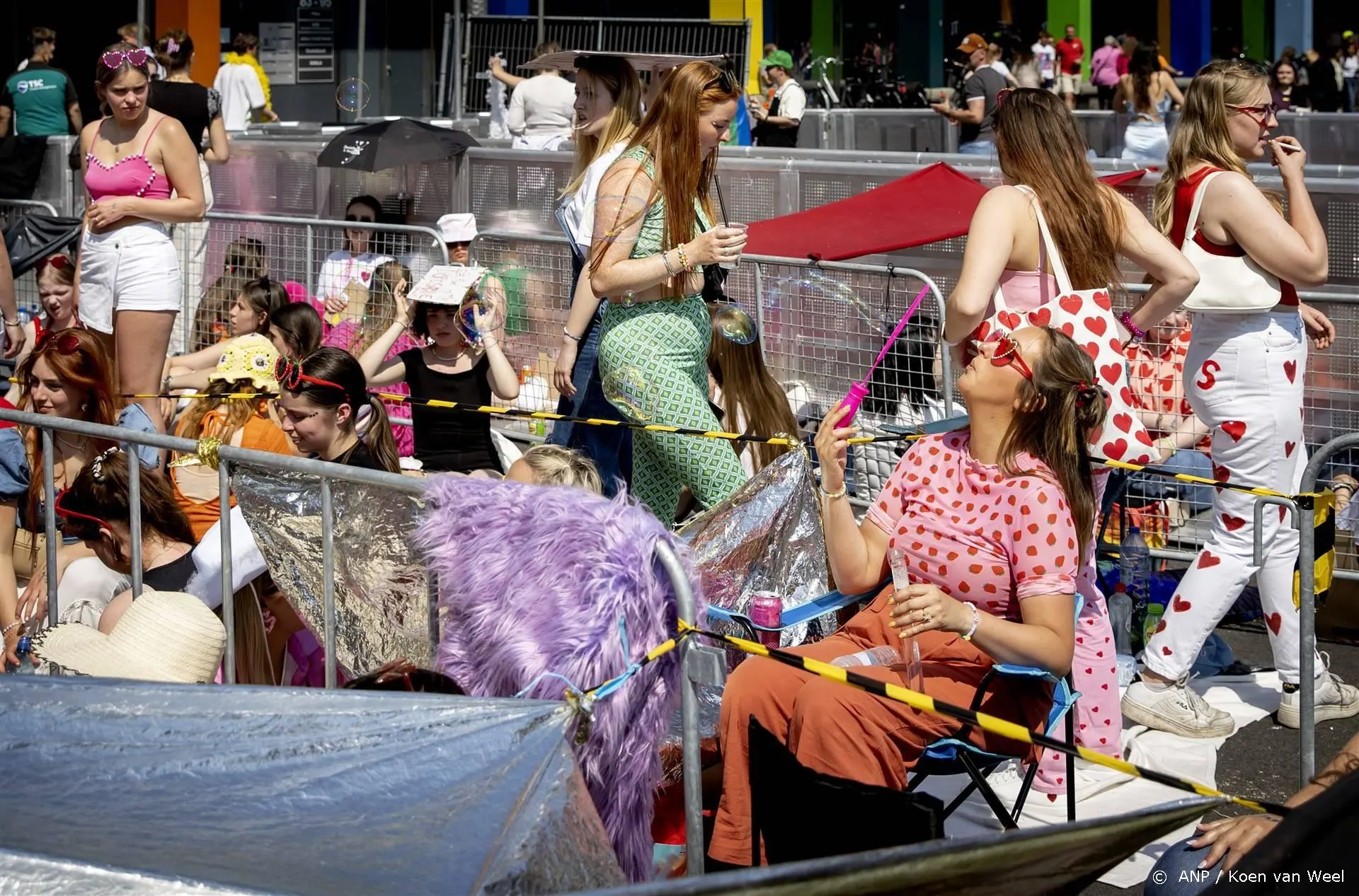 Rond 17.00 uur zijn verschillende rijen voor de ArenA te zien van fans die over het algemeen vrolijk gekleed zijn met boa's, glitterkleding en hartjesbrillen. De langste rij loopt van de ArenA naar Station Amsterdam Bijlmer ArenA en is tientallen meters lang. De fans die achteraan staan of zitten zijn net aangekomen, onder wie een moeder (50) en haar dochter (18) uit Zutphen. "Het is echt een fijne sfeer", zegt de 50-jarige vrouw. "Dat had ik al wel verwacht met dit zonnige weer."